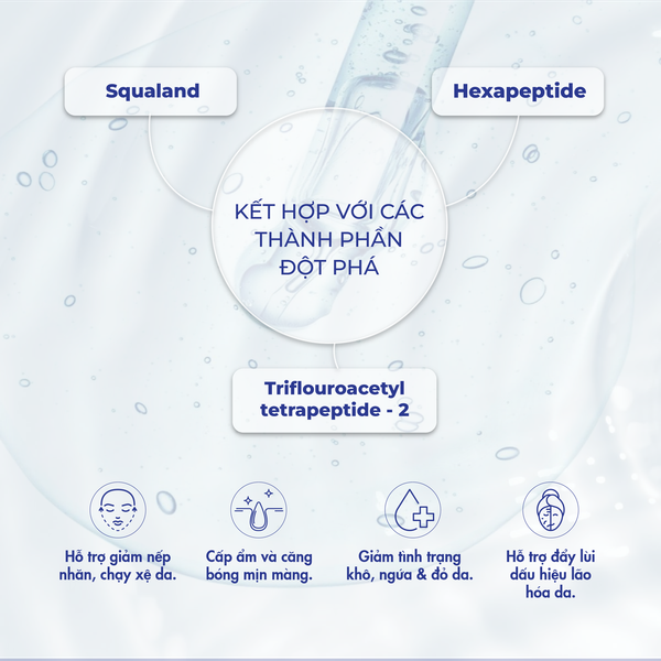 - Trifluoroacetyl Tripeptide - 2 & Squalane thế hệ thứ 3: giúp hỗ trợ chăm sóc da chuyên sâu, bổ sung độ ẩm, mang lại làn da trông mịn màng, mềm mại và tươi tắn hơn.