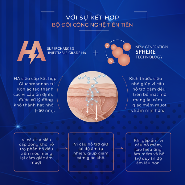 Công nghệ Sphere & HA trọng lượng phân tử kép: hỗ trợ bổ sung độ ẩm và giúp môi duy trì trạng thái ẩm mịn.